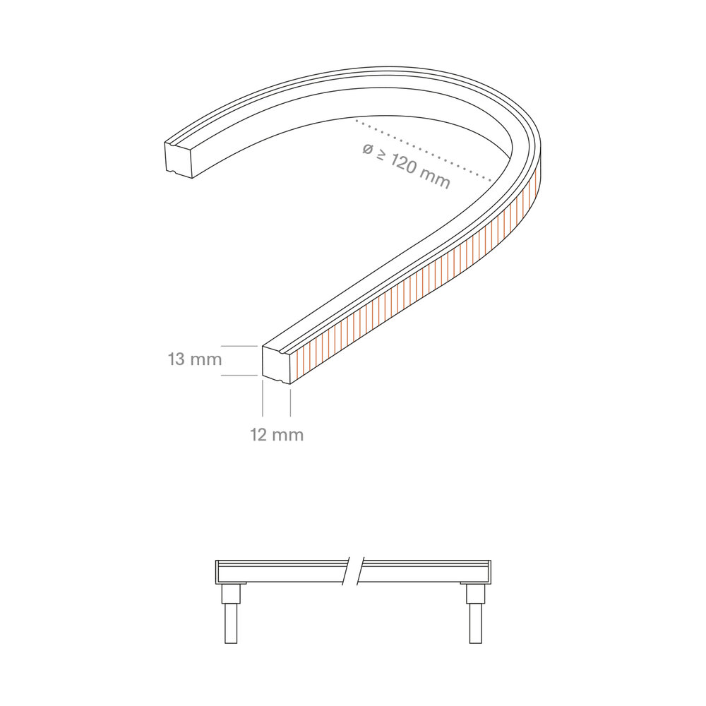 Der Stromauslass des Streifen befindet sich Bodenseitig. Dies hat den Vorteil das ein perfekter Übergang, ohne Schattenfuge, von zwei Bändern möglich ist. So kann die Einspeisung ganz unauffällig in dem Lichtobjekt versteckt werden.