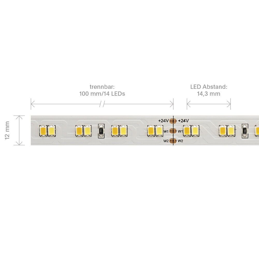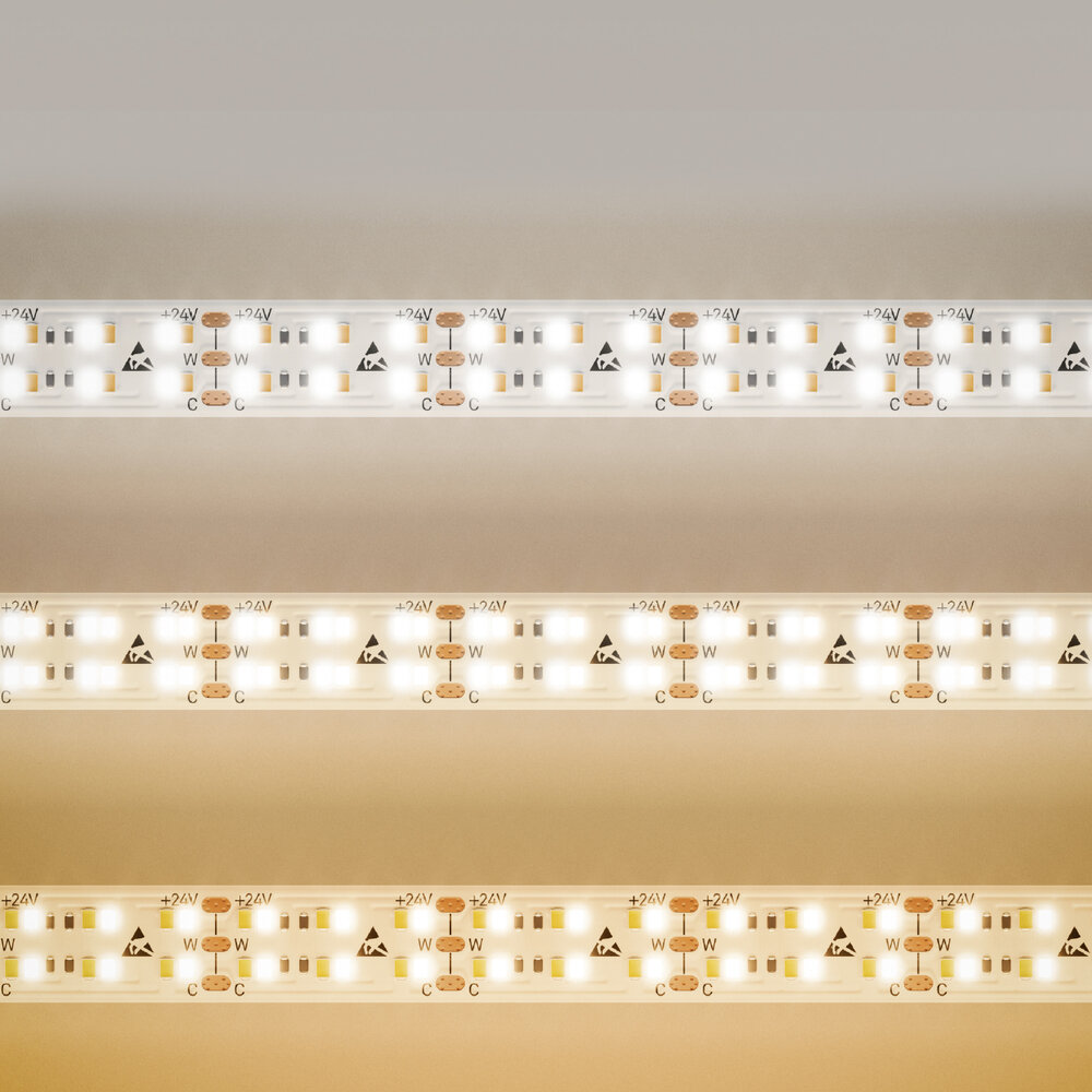 Unsere 14 W TUNABLE WHITE 24V Streifen setzt Licht- und Farbstimmungen im Objekt um. Zu verschiedenen Zeitpunkten setzen Sie mit dem Band verschiedene Lichtfarben in Szene. Die Lichtfarbe lässt sich von 6.500 K auf 2.700 K verschieben.