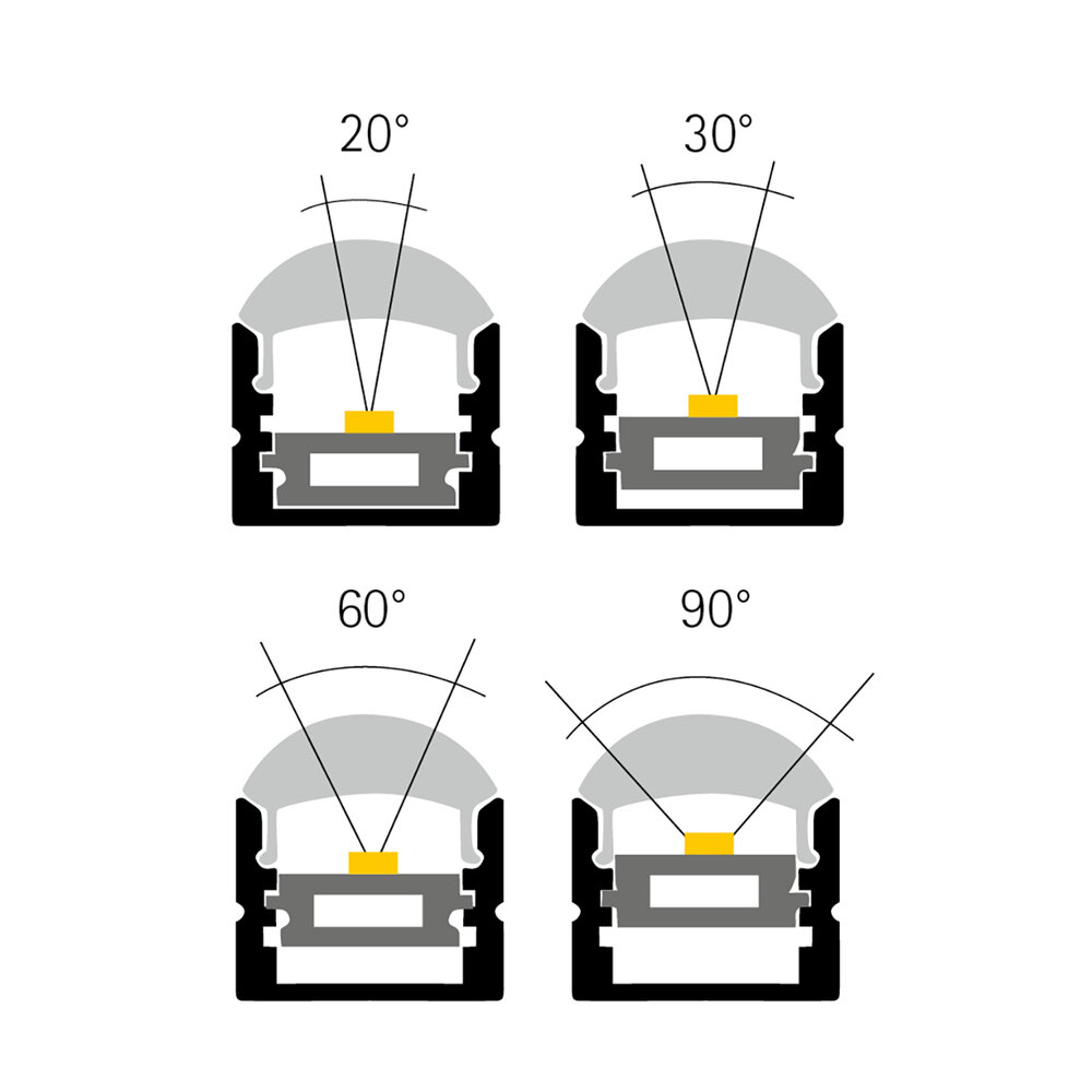 Unser Aufbauprofil Winkel 12 in der 1m-Variante findet seinen Einsatzbereich an Wand und Decke. Durch eine Umpositionierung der Zwischenbodenlässt sich der Abstrahlwinkel von 20° bis zu 90° verändern. Dies versetzt Sie in die Lage gezielte Lichtakzente zu setzen. Des Weiteren wird es zur Wärmeableitung des LED-Streifen verwendet, wodurch sich die Lebensdauer des verbauten Produktes verlängert. Zusätzlich dient es als Schutz vor Staub und Feuchtigkeit. In Verbindung mit einer matten oder opalen Abdeckung wird das Licht gestreut und das Lichtbild deutlich homogener. Alternativ kann auch eine klare Abdeckung verbaut werden. In das Profil können LED-Streifen bis zu einer maximalen Breite von 12,3mm eingebaut werden.