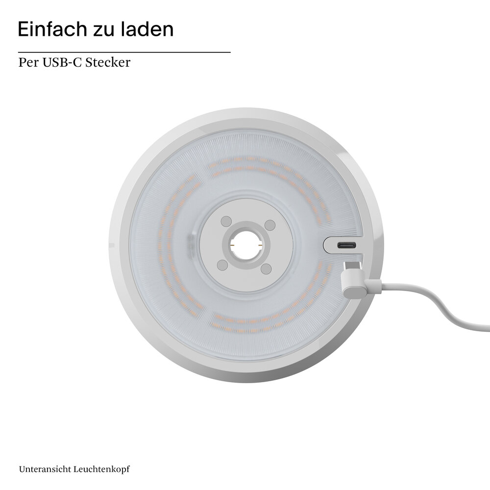 Wiederaufladbar: Mit dem beiliegenden USB-Netzteil und dem 1,2 m langen Ladekabel mit USB-C Stecker lässt sich die Akkuleuchte bequem und unkompliziert aufladen. So leuchtet sie bis zu 10 Stunden und das ganz ohne Kabel (Akku Li-Ion, 3.800 mAh).