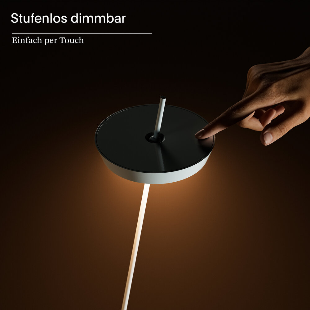 Einfache Bedienung: Die Leuchte lässt sich ganz einfach und intuitiv über den Touch-Schalter ein- und ausschalten sowie dimmen. Durch ihr hohes Eigengewicht (˜ 1 kg) hat sie einen soliden Stand.