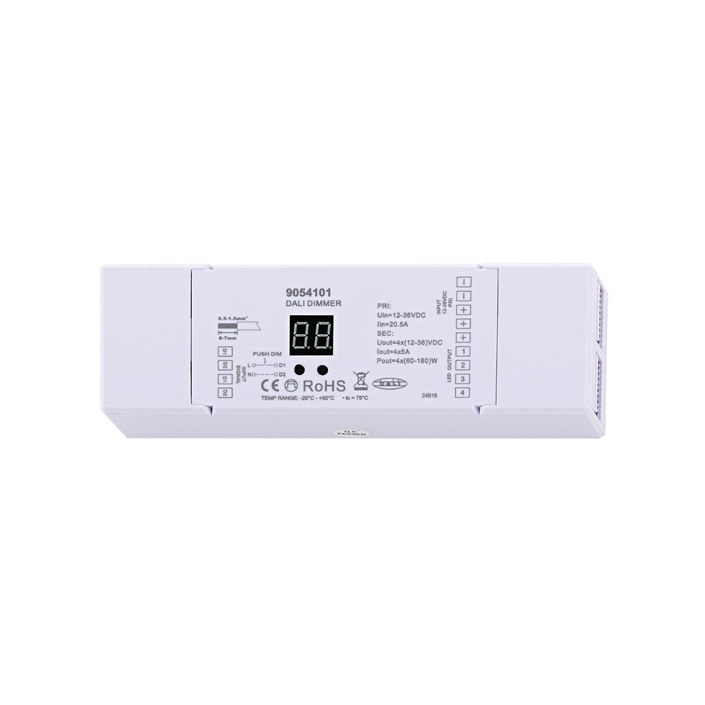 Der Empfänger DC/DC ist die optimale Erweiterung für Ihr DALI-System. Mit seinen 4 Ausgangskanälen kann er bis zu 4 Farben oder 4 einzelne Streifen steuern. Die maximale Gesamtleistung beträgt bis zu 480W bei 24V. Die Stromversorgung erfolgt über 12V oder 24V. Das Steuergerät hat eine Systemversion von DT8