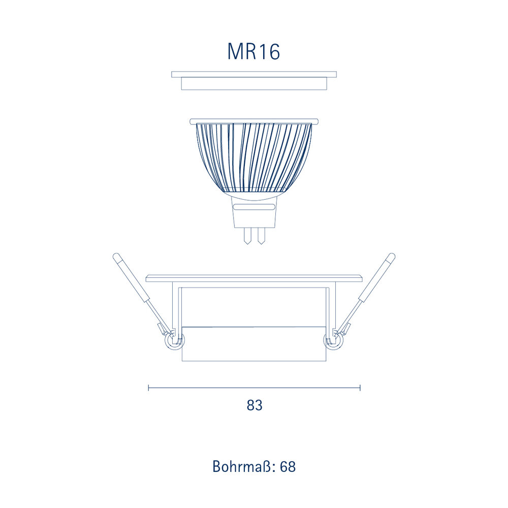 Die ALU-Einbauleuchte besitzt einen Schwenkbereich von 25°. Das Bohrmaß für den Einbau beträgt 68mm und das Außenmaß beläuft sich auf 83mm. Ein schneller Leuchtmittelwechsel ist durch das Herausziehen des Innenrings garantiert.