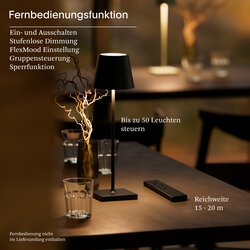 Die integrierte Ladefunktion von unten sorgt für eine besonders elegante Handhabung und ein aufgeräumtes Erscheinungsbild. Ideal für den professionellen Einsatz lässt sich die Leuchte zusätzlich komfortabel per Fernbedienung steuern. Helligkeit und Lichtstimmung können so flexibel angepasst werden – perfekt für Gastronomie, Hotellerie und anspruchsvolle Objektbereiche.