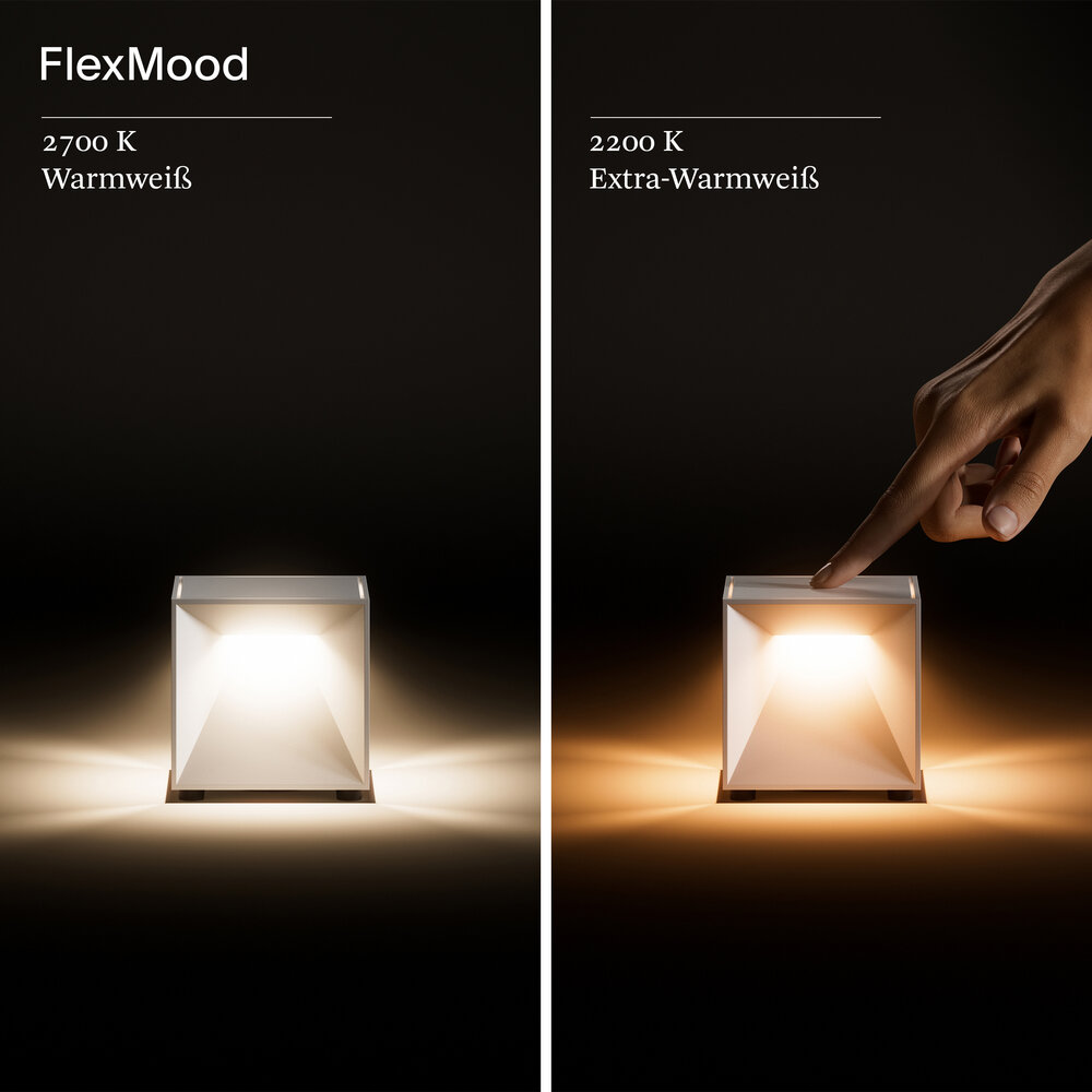 Stimmungsvoll: Das FlexMood-Feature bietet über den Touch-Dimmer warmweißes und blendfreies Licht in zwei Farbtemperaturen (2.700 K und 2.200 K). So verbreitet sie jederzeit die passende Lichtatmosphäre.