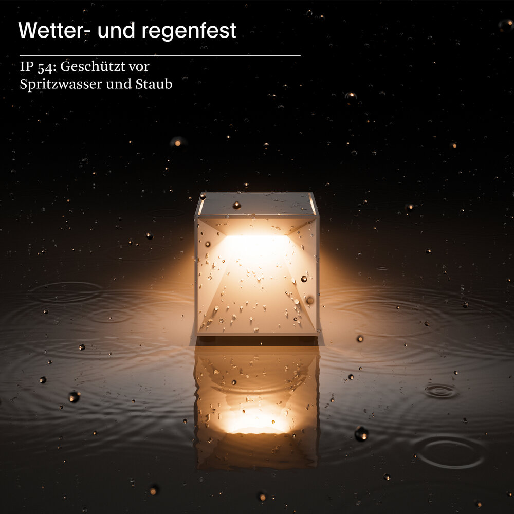 Innen & Außen: Die dimmbare Akku-Tischleuchte für den Wohn- und Außenbereich hält dank Schutzart IP54 (spritzwassergeschützt) auch Regenschauer aus.