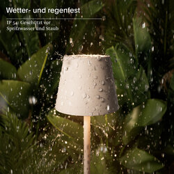 Innen & Außen: Die dimmbare Akku-Tischleuchte für den Wohn- und Außenbereich hält dank Schutzart IP54 (spritzwassergeschützt) auch Regenschauer aus.