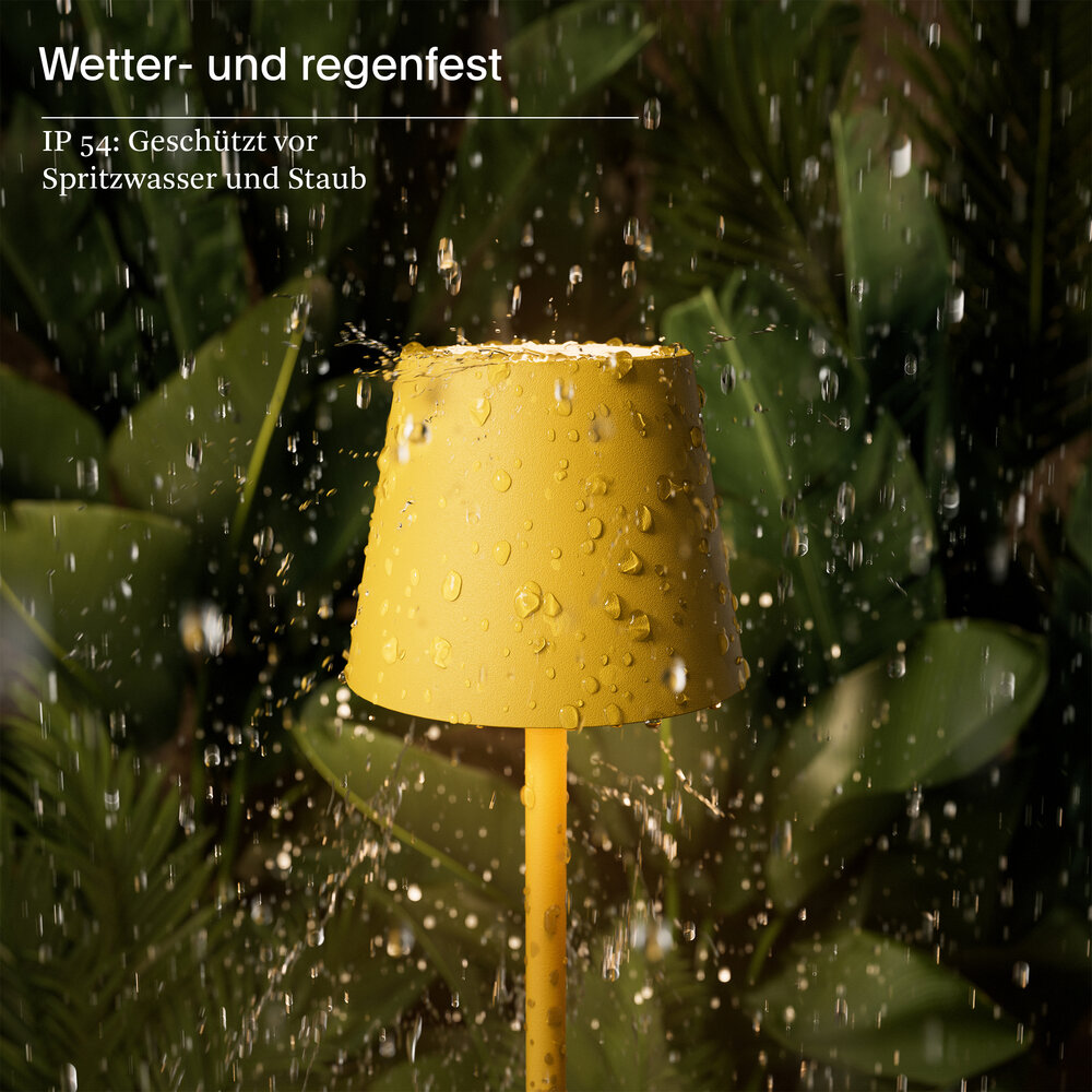 Innen & Außen: Die dimmbare Akku-Tischleuchte für den Wohn- und Außenbereich hält dank Schutzart IP54 (spritzwassergeschützt) auch Regenschauer aus.