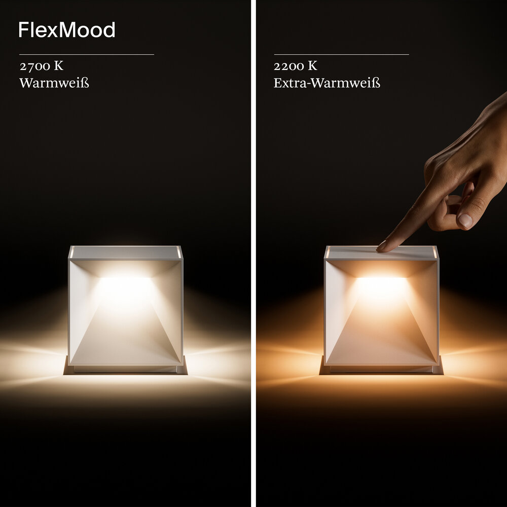 Stimmungsvoll: Das FlexMood-Feature bietet über den Touch-Dimmer warmweißes und blendfreies Licht in zwei Farbtemperaturen (2.700 K und 2.200 K). So verbreitet sie jederzeit die passende Lichtatmosphäre.