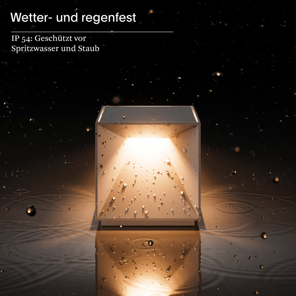 Innen & Außen: Die dimmbare Akku-Tischleuchte für den Wohn- und Außenbereich hält dank Schutzart IP54 (spritzwassergeschützt) auch Regenschauer aus.