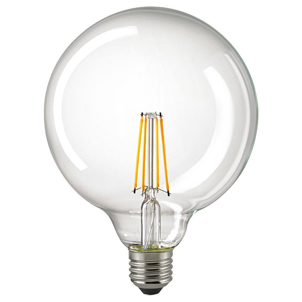 Unsere 7W Filament Globelampe ist durch Ihren klassischen Look der optimale Ersatz für traditionelle dekorative Beleuchtung. Sie ist mit der modernsten Filamenttechnologie ausgestattet und weisst somit eine hohe Dimmerkompatibilität auf. Ihre Farbwiedergabe mit einem RA-Wert von 90 lässt alles farbgetreu erstrahlen. Der niedrige Stromverbrauch der Filament wird durch die gute Energieeffizienzklasse bestätigt. Das Lumenpaket unserer Filament lässt sich mit einer 60W herkömmlichen Glühlampe vergleichen. Ihr klarer Glaskolben legt den Blick frei auf die ausgereifte Technik des Leuchtmittels.