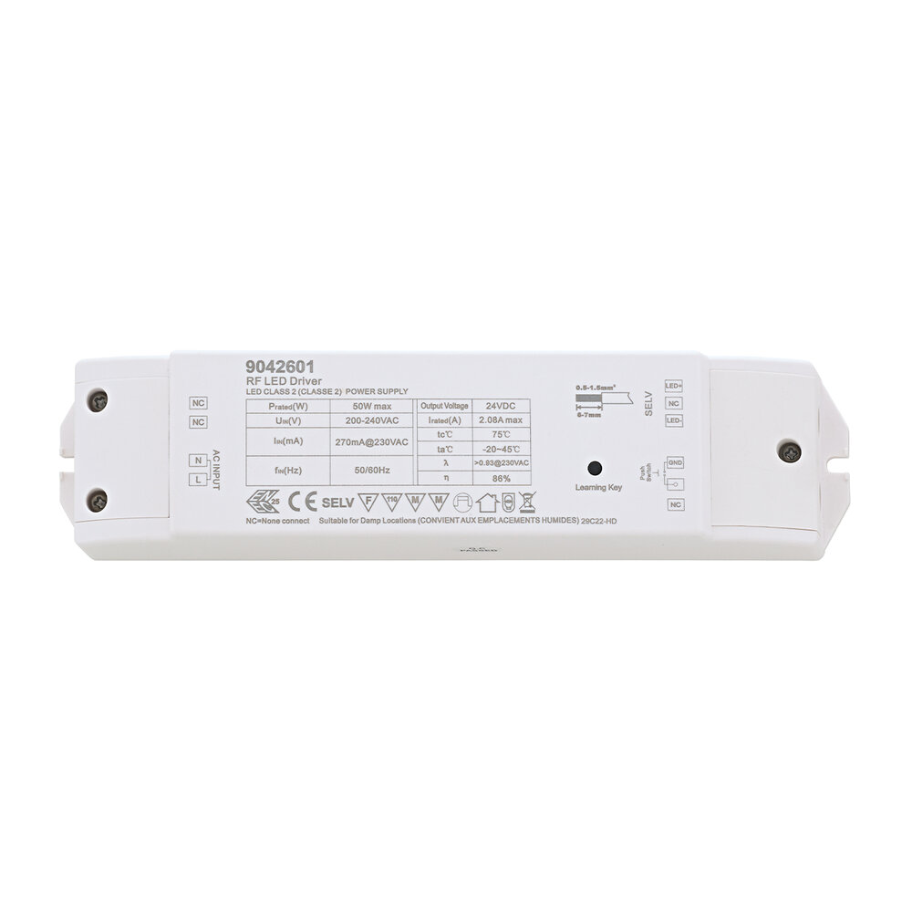 Der Universalempfänger wird zur Steuerung von einfarbigen Lichtbändern verwendet. Durch das integrierte 50 W LED-Treiber Reduziert sich der Installationsaufwand. Es setzt das Funksignal der Fernbedienung um. Die Stromversorgung erfolgt über 230V. Bei der Übertragung wird die 868 MHz Funkfrequenz verwendet. Mit der verbauten Push-Dim-Funktion, kann auch ohne RF-Fernbedienung über einen vorhandene Druckschalter der Empfänger gesteuert werden.
