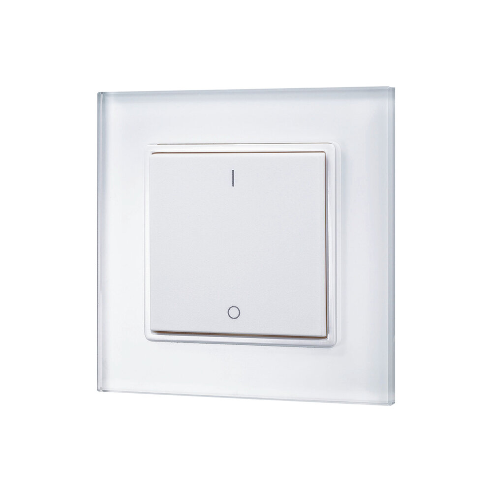 Die Wandfernbedienung Taster 1 Kanal Dim wird zur Steuerung von einfarbigen Lichtbändern verwendet. Es kann eine Zone mit unlimitierter Anzahl von Empfängern gesteuert werden. Durch die flache Bauweise in der Optik eines Tasterschalters ist keine Einbaudose notwendig. Der hochwertige Glasrahmen ist abnehmbar und ermöglicht die Integration des Senders in bestehende Schalterprogramme mit den Maßen 55 x 55 mm.