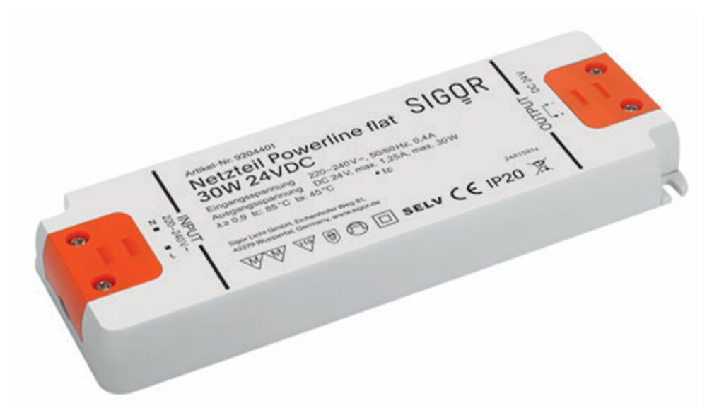 Unser 30W Powerline Treiber Flat in 24V findet seinen Einsatzbereich bei der Stromversorgung von LED-Bändern und Modulen. Das Gehäuse mit Schutzart IP20 ist nicht für die Anwendung im Außenbereich geeignet. Die Mindestlast des Treibers liegt bei 10% der Gesamtleistung. Unsere Treiber sind geschützt vor Kurzschlüssen, Überlast und Überspannung.